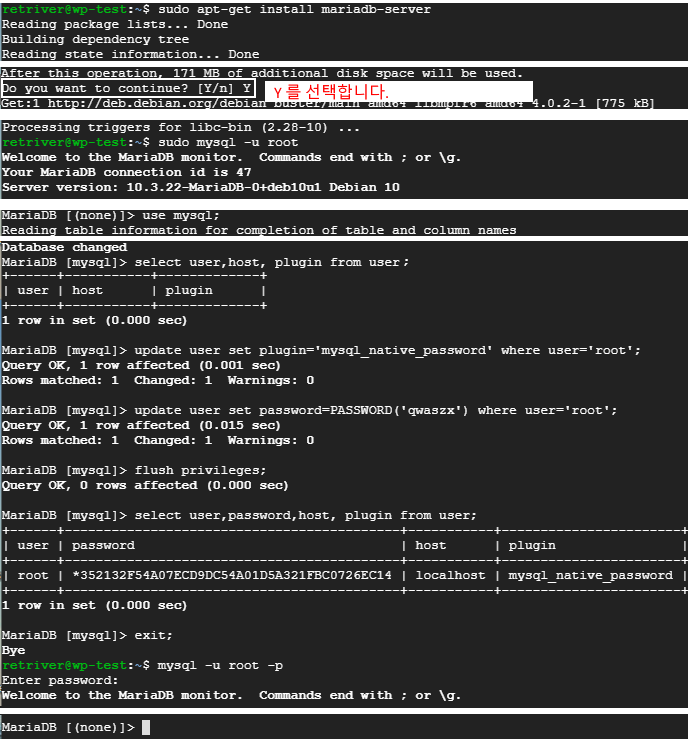3. Maria Db 설치 및 설정 ( Mysql 설치가 에러가 나서..--; ) sudo apt-get install mariadb-server sudo mysql -u root use mysql; select user,host, plugin from user; -- 패스워드 타입확인 update user set plugin='mysql_native_password' where user='root'; -- 패스워드 타입 변경 update user set password=PASSWORD('qwaszx') where user='root'; -- 비밀번호 변경 flush privileges; select user,password,host, plugin from user; -- 패스워드 타입확인 exit; mysql -u root -p -- root 계정으로 로그인 Enter password: -- 비번 (qwaszx) 입력