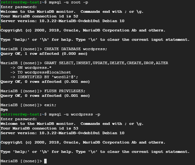 4.3. wordpress db, 계정생성 mysql -u root -p --root 접속 ( password : qwaszx ) CREATE DATABASE wordpress; -- 데이터베이스 생성 GRANT SELECT,INSERT,UPDATE,DELETE,CREATE,DROP,ALTER ON wordpress.* TO wordpress@localhost IDENTIFIED BY 'word12!@'; -- 계정/권한 생성 FLUSH PRIVILEGES; exit; mysql -u wordpress -p -- 접속 테스트 ( password :word12!@ )