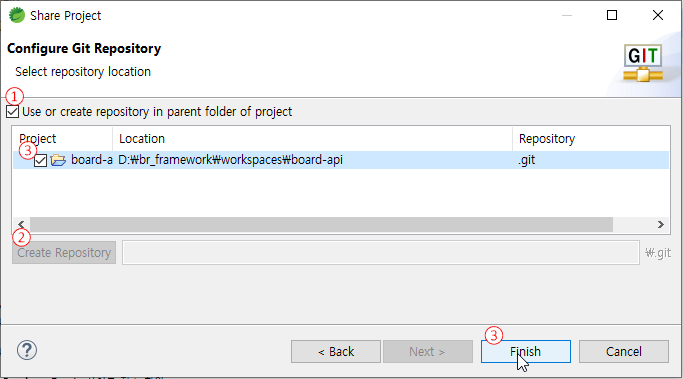 3.1. Use or create repository in parent folder of project 체크 * 선택한 프로젝트 폴더 내에 로컬 저장소 생성