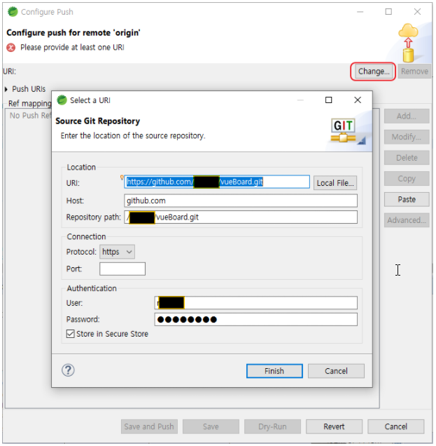 6.3. Change.. 버튼 클릭( '5.3' 에서 복사한 정보가 자동 세팅된다. ), Finish 버튼 클릭