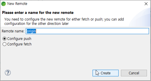 5.1. '4.' 에서 만든 git repo 선택후 Remotes 마우스 오른쪽 클릭. CreateRemote.. 선택