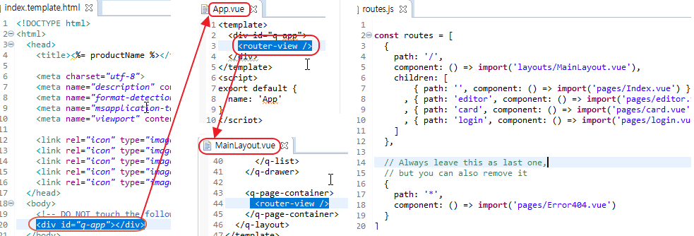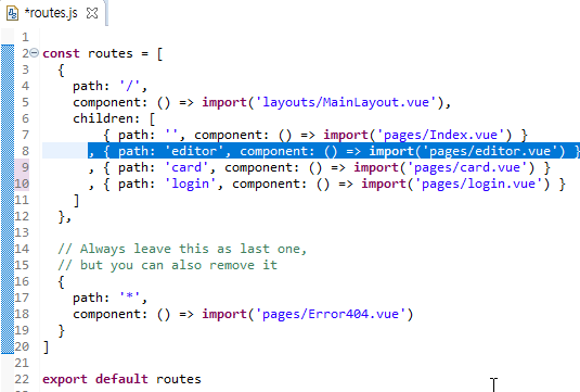 2.3. routes.js 에 방금 생성한 editor.vue uri 정보를 등록합니다.