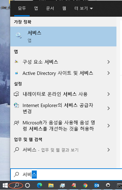 3.1. 작업표시줄의 돋보기 버튼을 선택하고 '서비스' 입력후, 선택한다.
