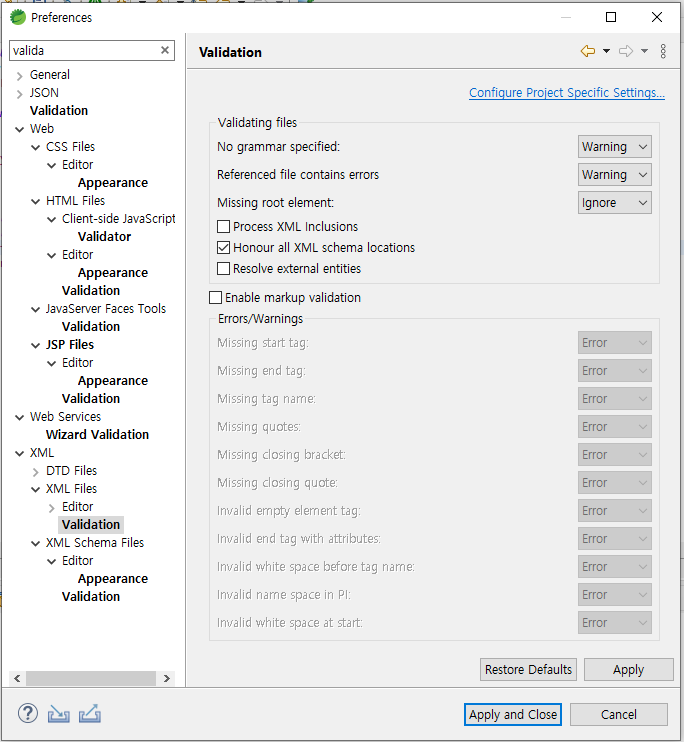 Preferences > XML > XML Files > Validation 메뉴로 이동 후,
