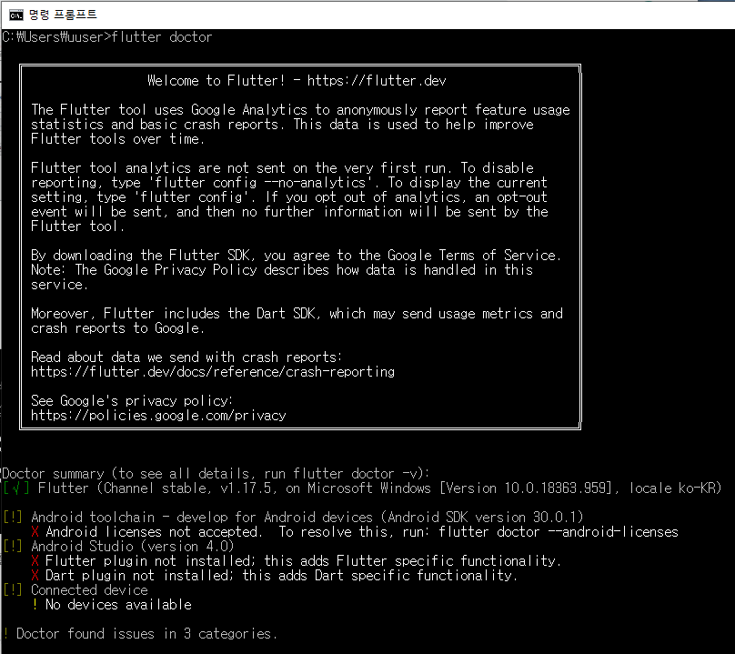 명령 프롬프트 실행하여 flutter doctor 입력. *한참뒤에 결과가 나온다