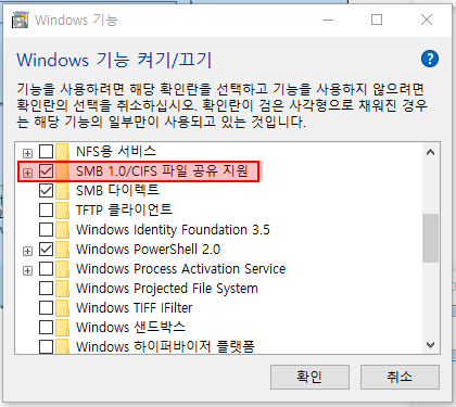 2. SMB 1.0/CIFS 파일 공유 지원 항목을 체크한다.
